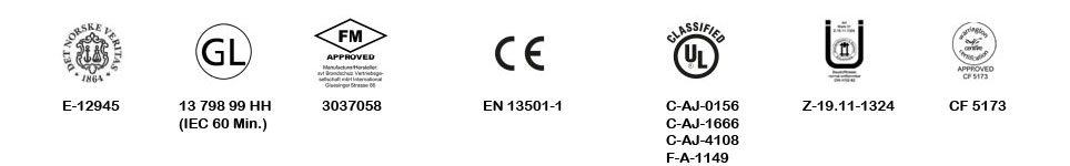 • ได้รับการรับรองมาตรฐานจาก UL1479, DIN, DNV, FM, SOLAS และ EN, GERMAN LLOYD